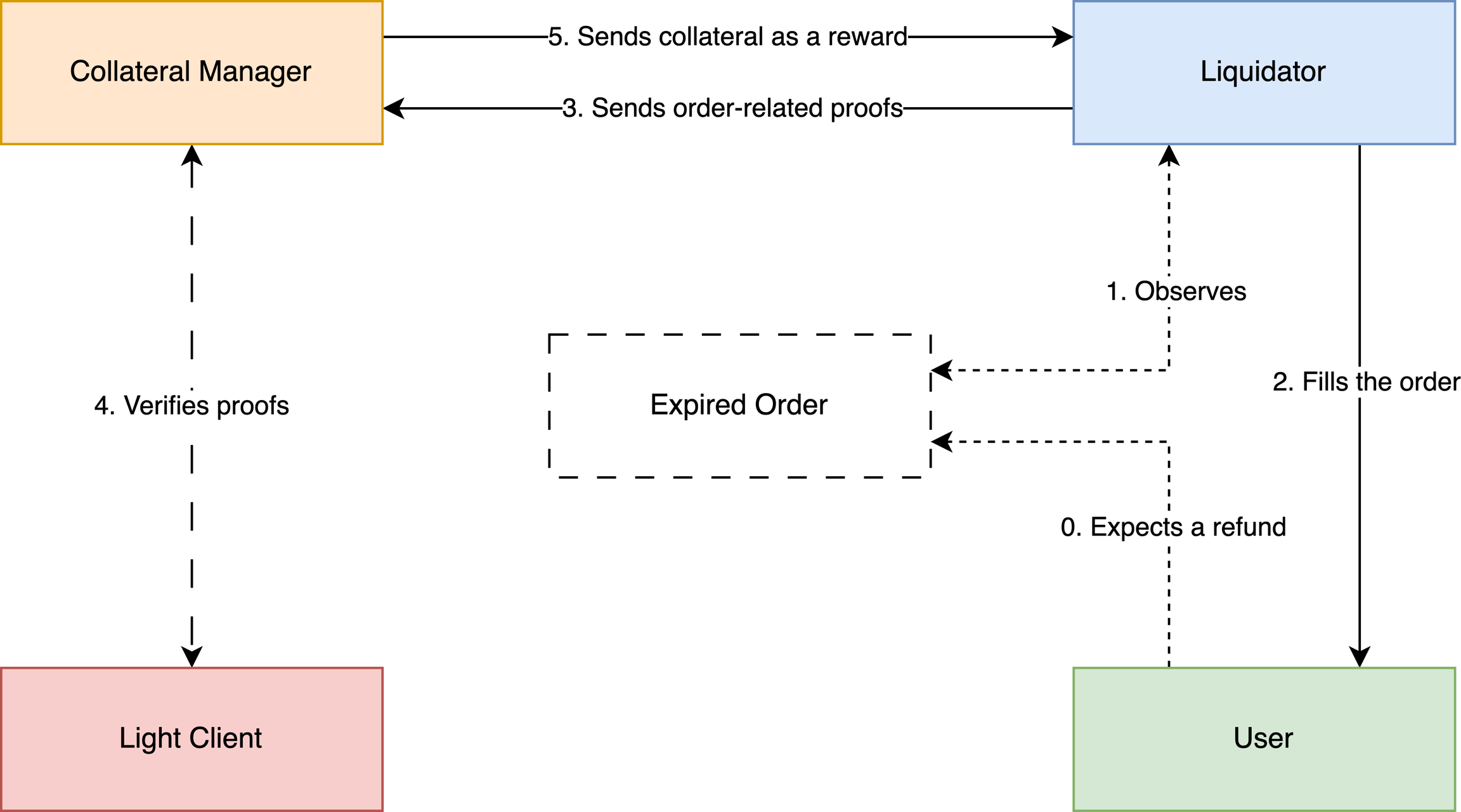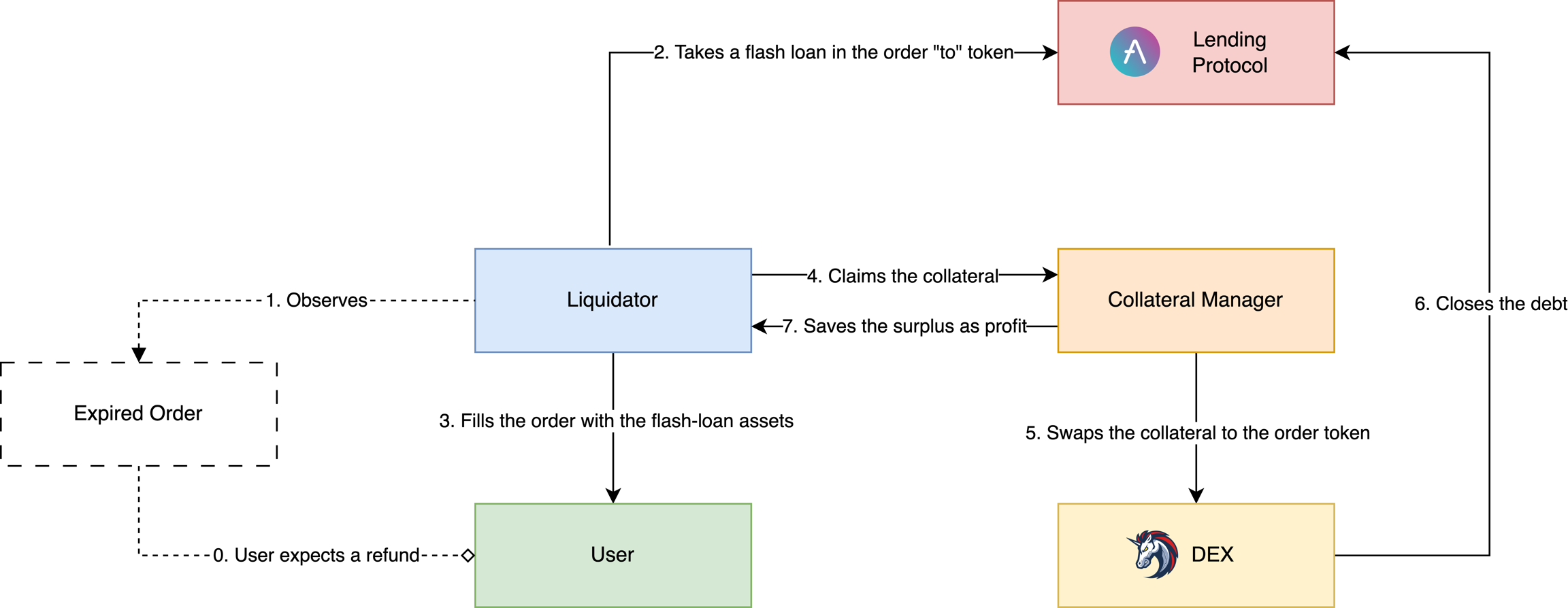 In this flow, a Liquidator fills the expired order by sending their own assets to a User instead of a Resolver.