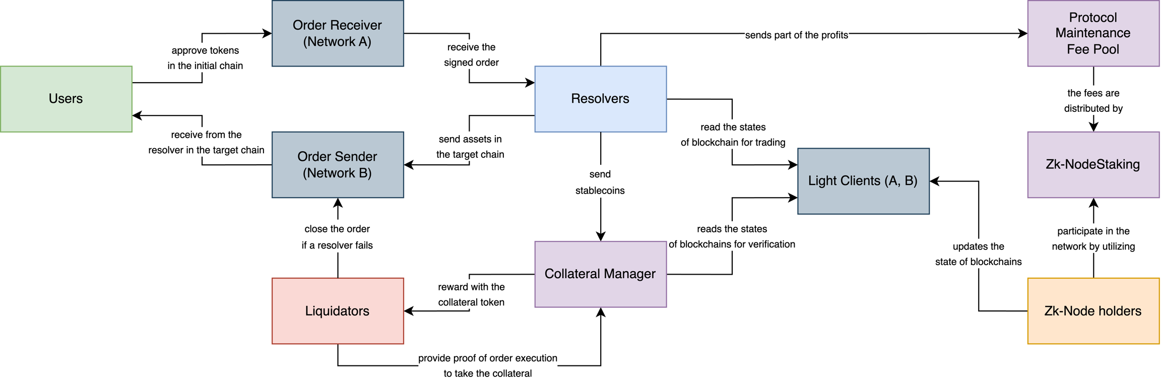Resolvers can borrow additional liquidity from the Liquidity Pool by pledging their collateral. This pool provides multi-chain over-collateralized loans for supported assets (primarily stablecoins).
